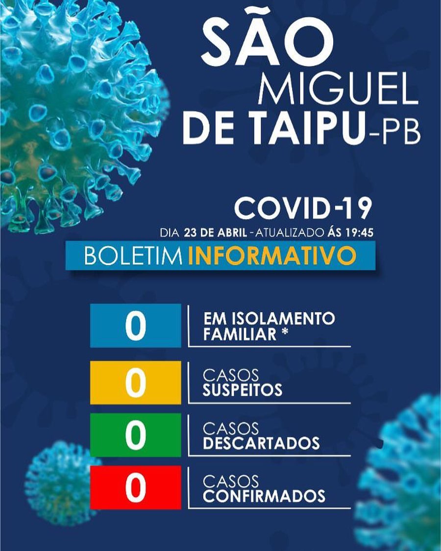 A secretaria de saúde do município de São Miguel De Taipu informa em 24 de abril de 2020, que até o momento não temos nenhum caso suspeito, nem casos confirmados. São Miguel segue com a medidas de prevenção e combate ao coronavírus.